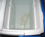 5. Now you have a stiff piece of goat skin cut to size. How do you stretch it and make it bend o your will? I like to torture it with really hot water. Find a bucket or something that would cover the skin if it was standing on its side (That is how it will float, very surreal looking) I used a small cooler. Fill it with the hottest tap water you can and soak the skin for 5 minutes. While it soaks get everything you need to install the head with in arms reach of  where you are going to do the deed. Once you start you have a limited time before it starts to get stiff again.